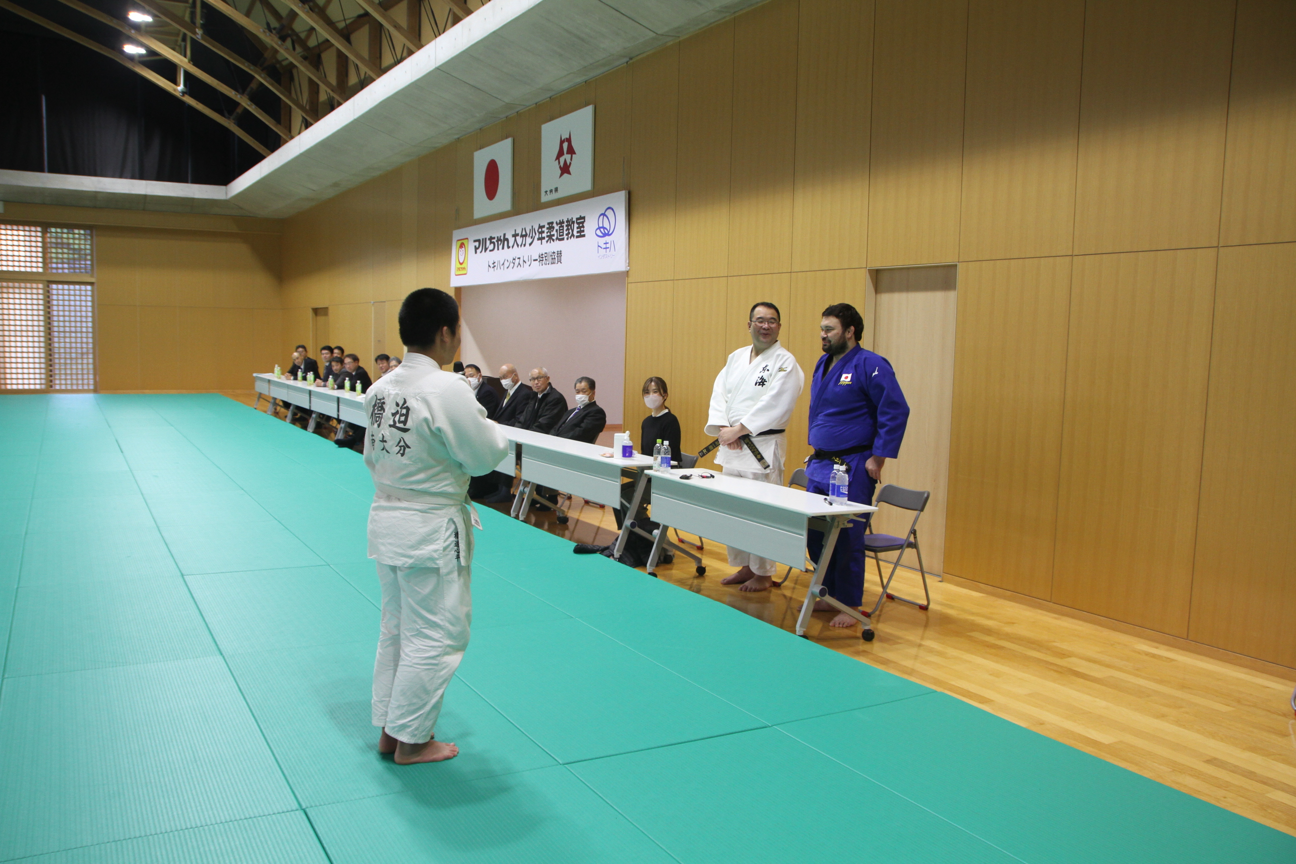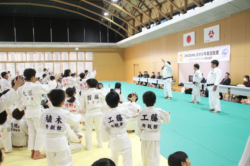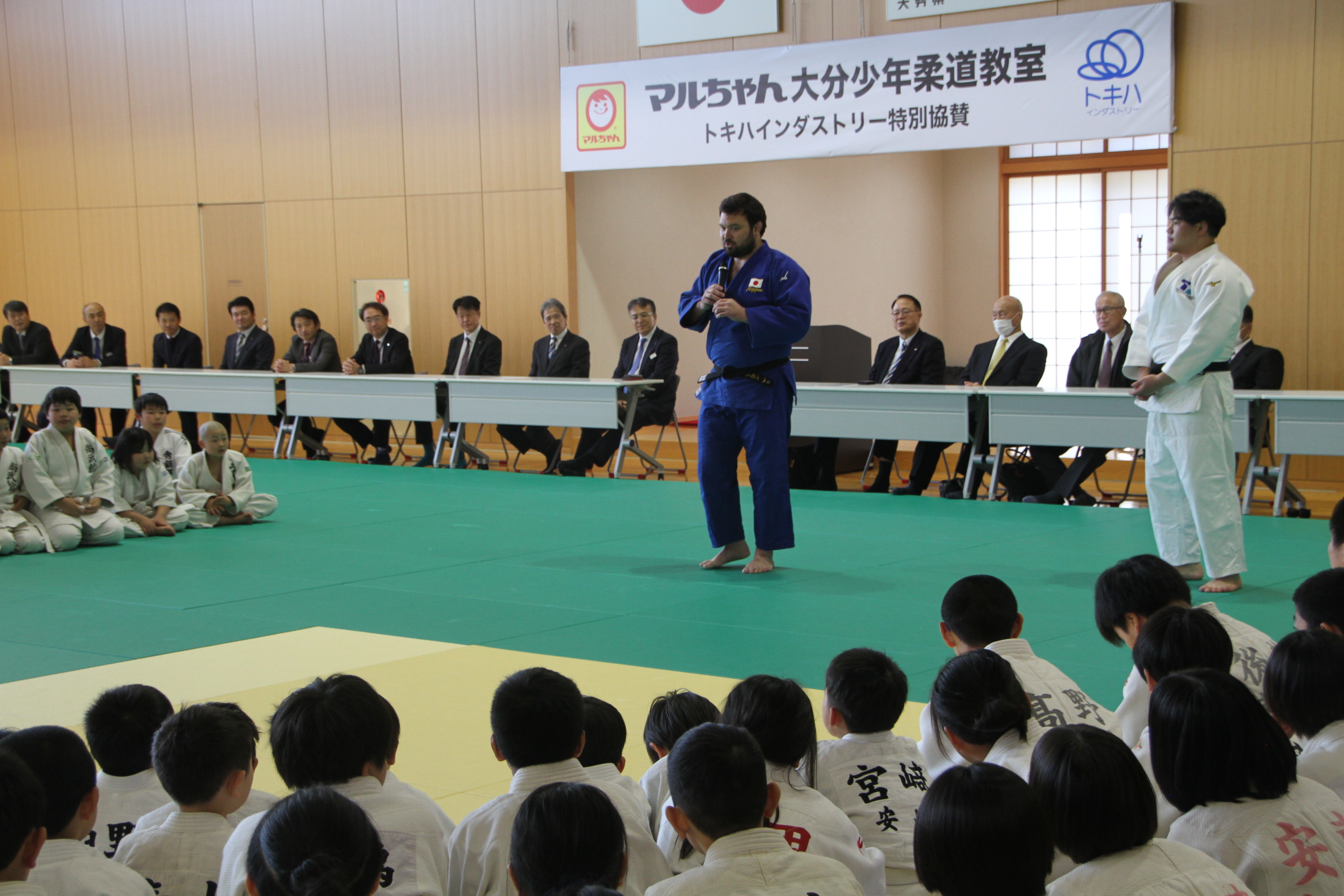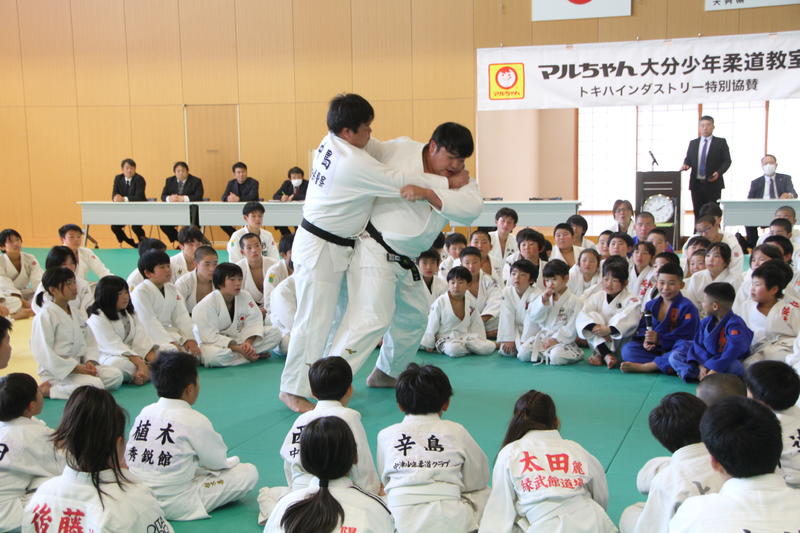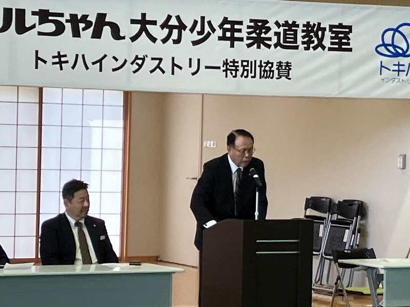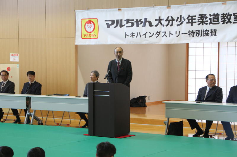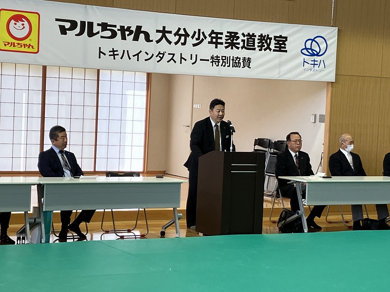 主催者として、本連盟の穴井会長、そして東洋水産株式会社全体事業部事業部長の神永 憲様のご挨拶に続き、今回特別協賛をいただきましたトキハインダストリー代表取締役社長の羽田野尚志様よりご挨拶をいただいた後、柔道教室を行いました。