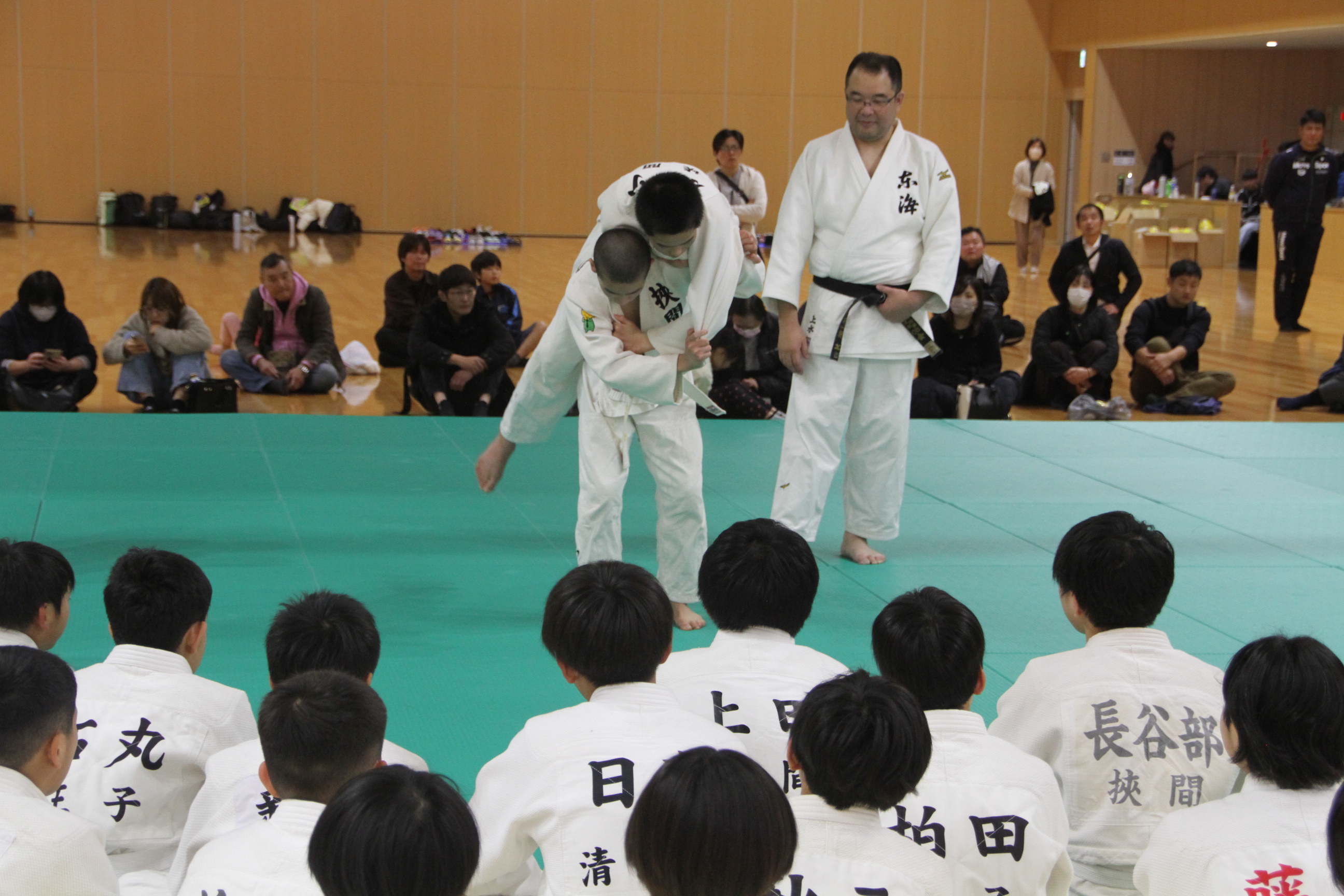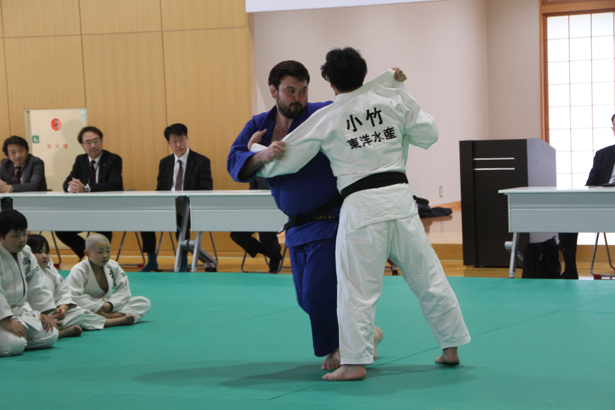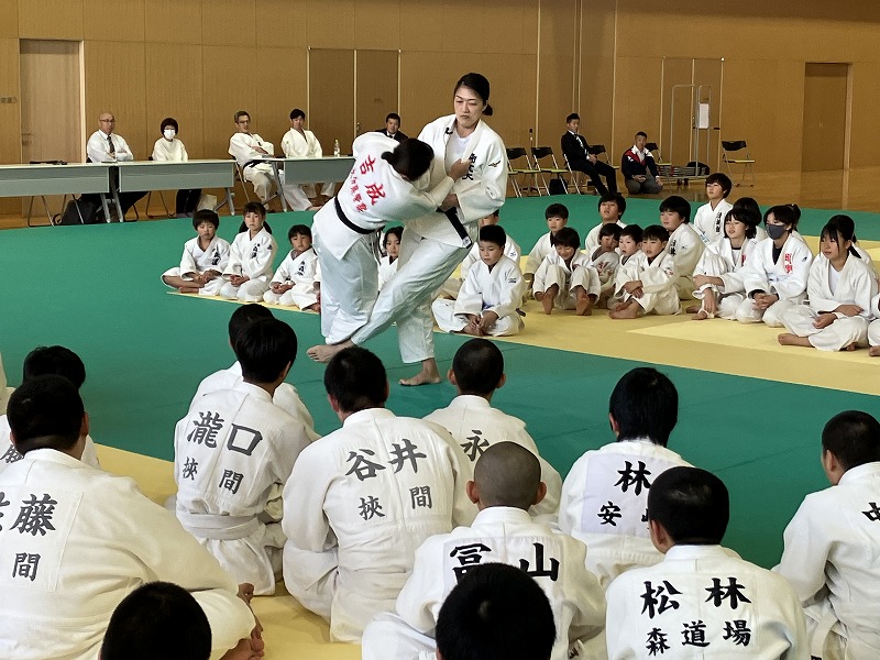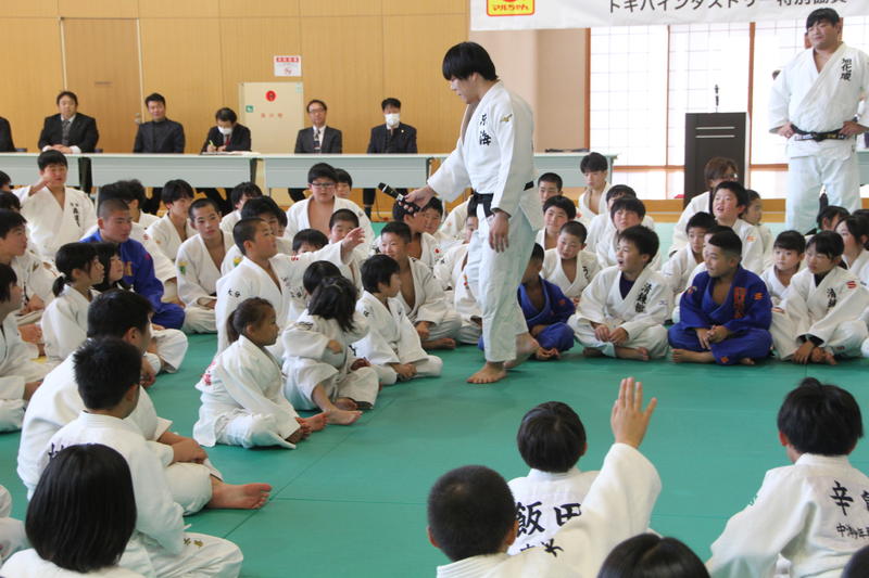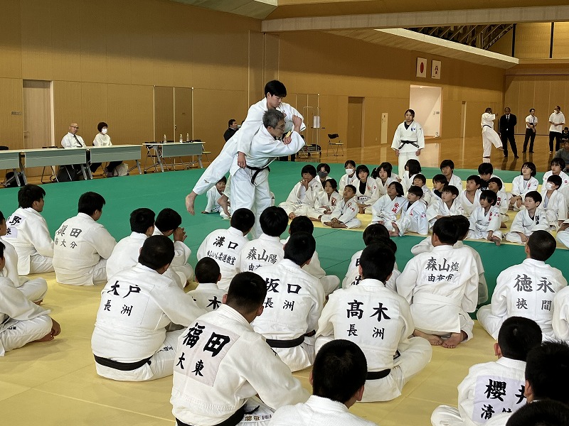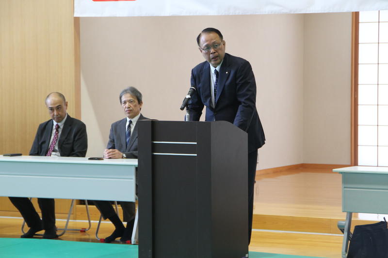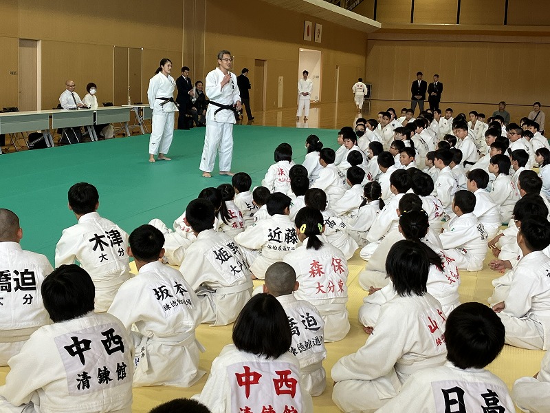 主催者として、本連盟の穴井会長、そして東洋水産株式会社全体事業部事業部長の神永 憲様のご挨拶に続き、今回特別協賛をいただきましたトキハインダストリー代表取締役社長の羽田野尚志様よりご挨拶をいただいた後、柔道教室を行いました。